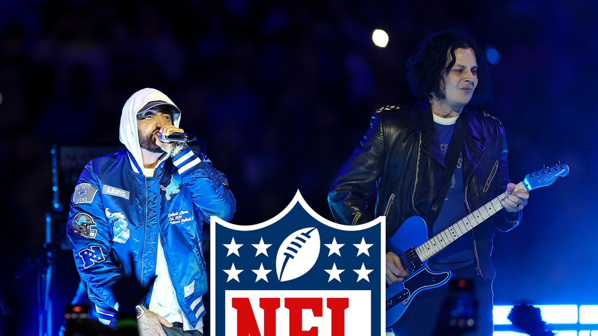 Eminem hit the stage in full Detroit armor — hoodie up and rocking a custom Lions jacket — and launched into a wild mashup of “Till I Collapse” with the White Stripes’ “Hello Operator.”