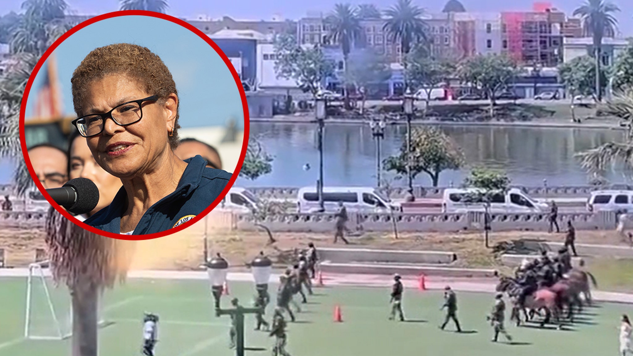 Horse-mounted federal brokers robed in tactical gear descended on a Los Angeles park alongside about 90 members of the California Nationwide Guard Monday — a transfer Mayor Karen Bass is condemning as a “political stunt.”