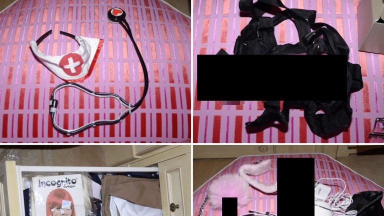 Inside a drawer, there’s a package labeled “Incognito Wigs,” and there are also neatly folded costumes apparently used for cosplay … along with a stethoscope and nurse’s headband.