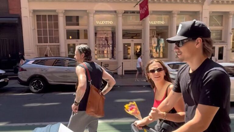 The proud dad and mom lined up their child and went into Fanelli’s Cafe … then did some purchasing at Louis Vuitton … the place Jake held the kid in his arms.