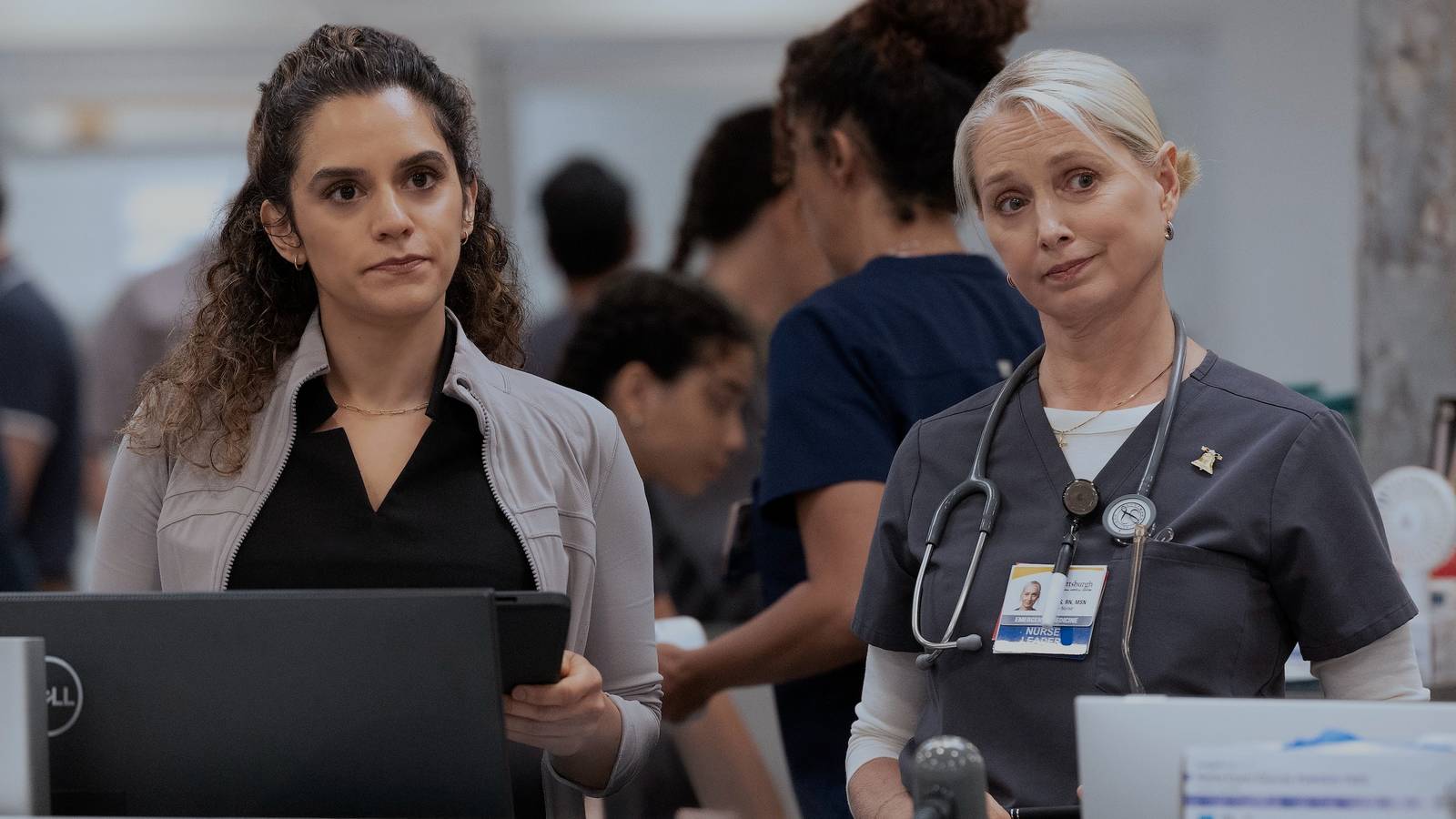 The doctors and nurses of The Pitt season 1 looking defeated around Dana on the phone