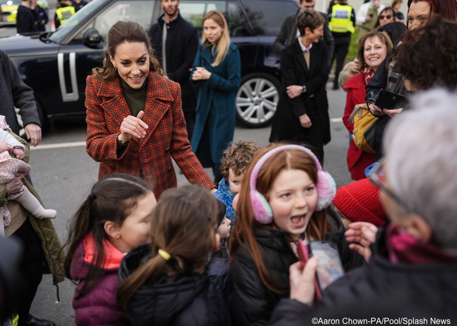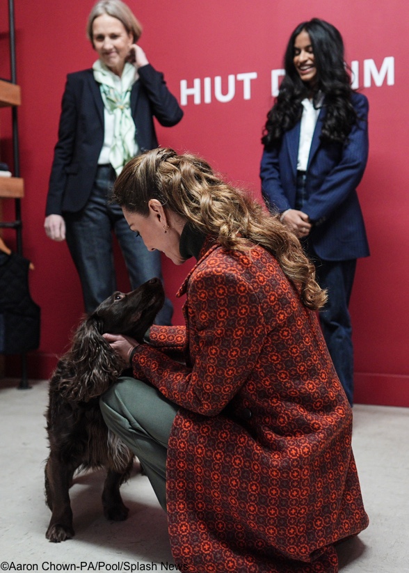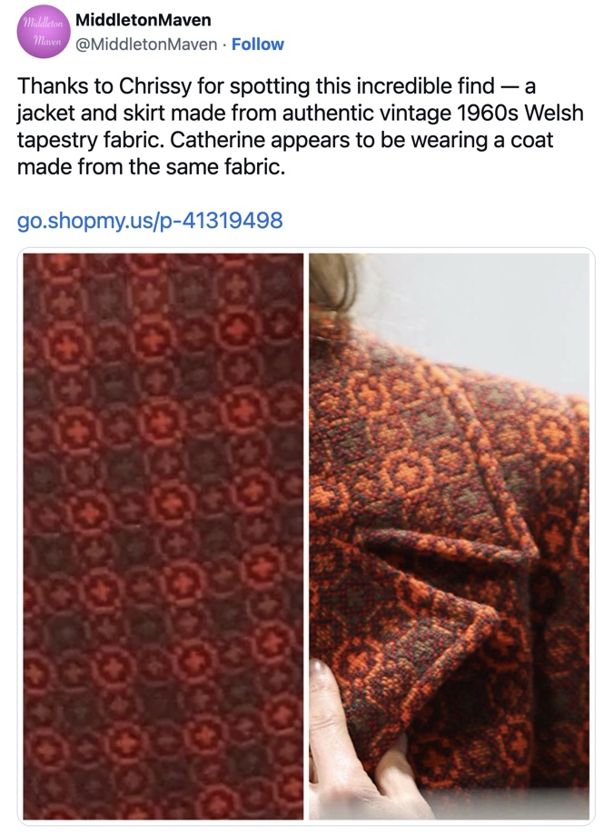 Her coat appears to be made from vintage Melin Tregwynt fabric, a tapestry wool in the Vintage Rose pattern. Thank you to ace IDer Chrissy for sharing a vintage fabric listing with Middleton Maven, which she posted online.
