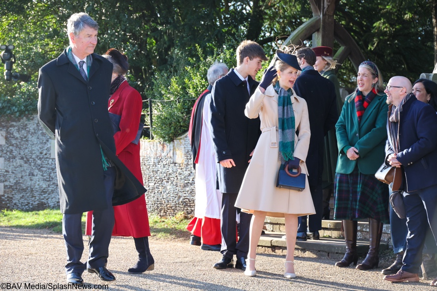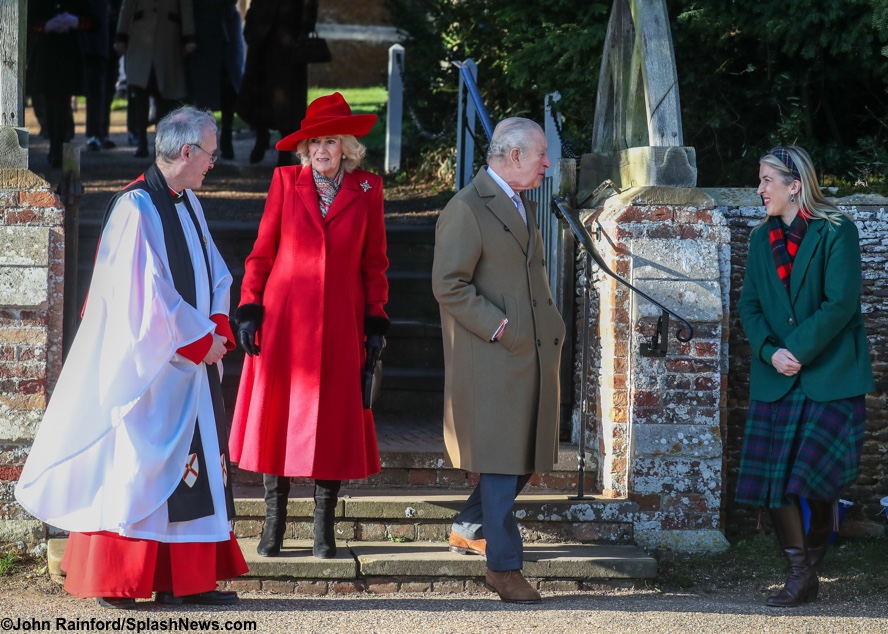 First, Christmas Day, and a full complement of Royal Family members attending services at St. Mary Magdalene Church on the grounds of the Sandringham estate. Below, the King, Queen, the Princess Royal (behind the Queen) with her husband, Vice Admiral Sir Tim Laurence, Princess Eugenie, and her husband, Jack Brooksbank, the Duke of Edinburgh, and Zara Tindall.