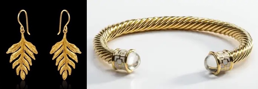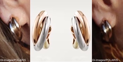 And her Cartier Trinity Earrings in 18-carat yellow, rose, and white gold.