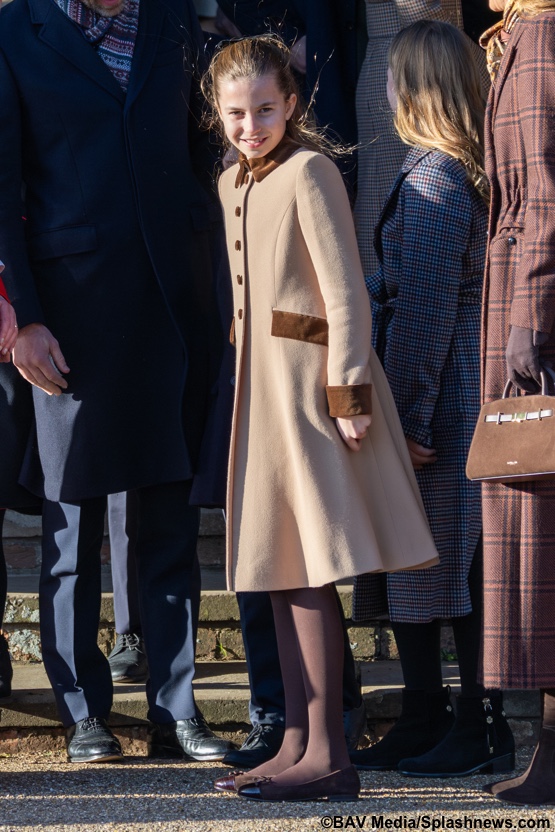 Princess Charlotte’s coat is a Catherine Walker design. Her shoes are by Tory Burch, the Cap Toe Croc-Effect Suede Ballet Flats ($300 at Zappos), with thanks again to Kate Middleton Styled for the shoe ID.