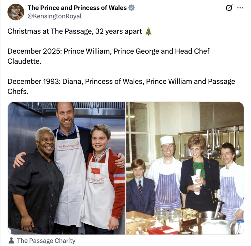 One more Christmas-time update to share involves Prince George following in his father’s footsteps by visiting The Passage charity, just as his father did back in 1993.