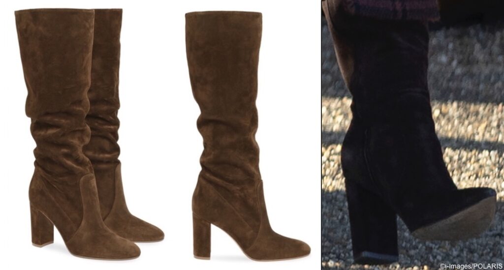 The Princess brought back her Gianvito Rossi custom boots in brown suede, similar to the brand’s Glen style, although the Glen has a more rounded toe than the boots worn by the Princess.