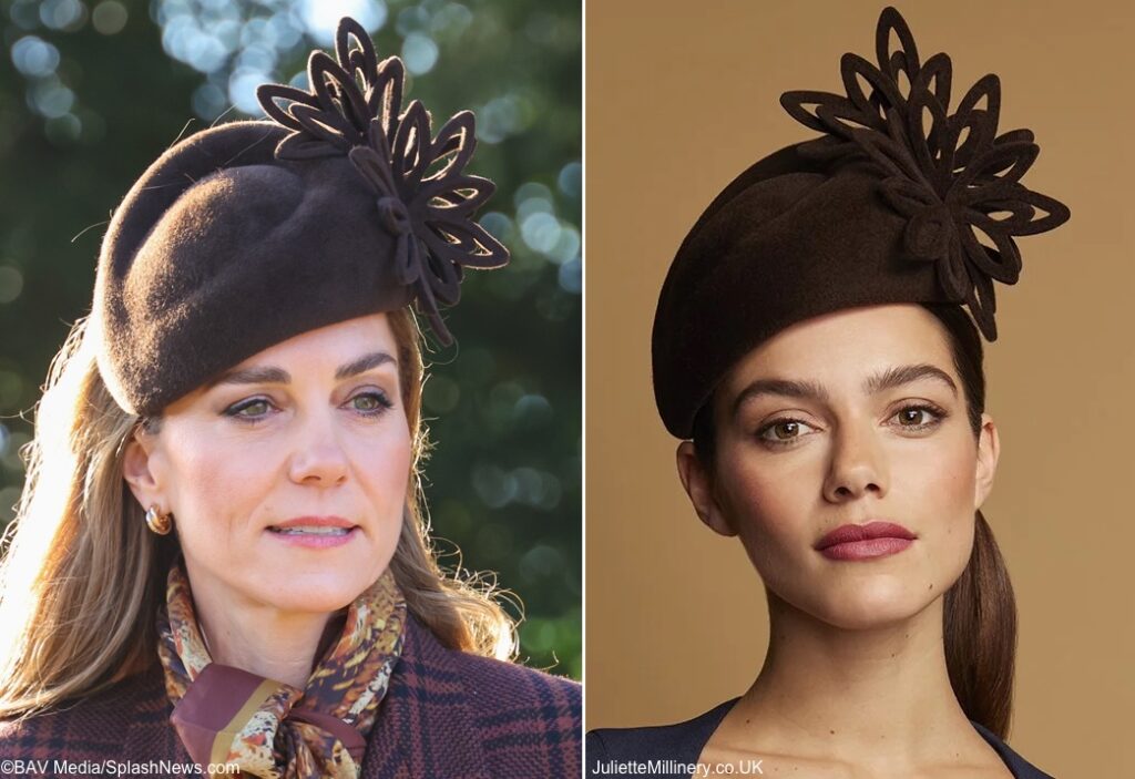 The Princess wore a hat by Juliette Botterill we’d not seen before: the milliner’s Felt Lace Percher Hat (£650, about $880 at today’s exchange rates), in chocolate-brown peachbloom felt with intricate cutouts. The description notes it is “worn on a slim headband with hat elastic, available in your choice of hair colour to ensure a secure and comfortable fit.” Thank you to Kate Middleton Styled on Instagram for the hat ID.