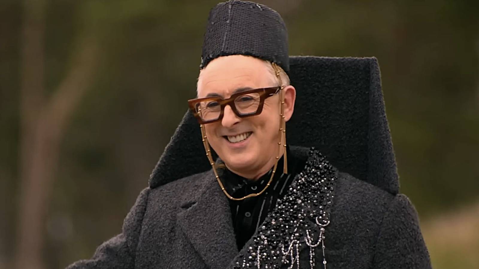 Alan Cummin in gold, smiling to the cast of The Traitors